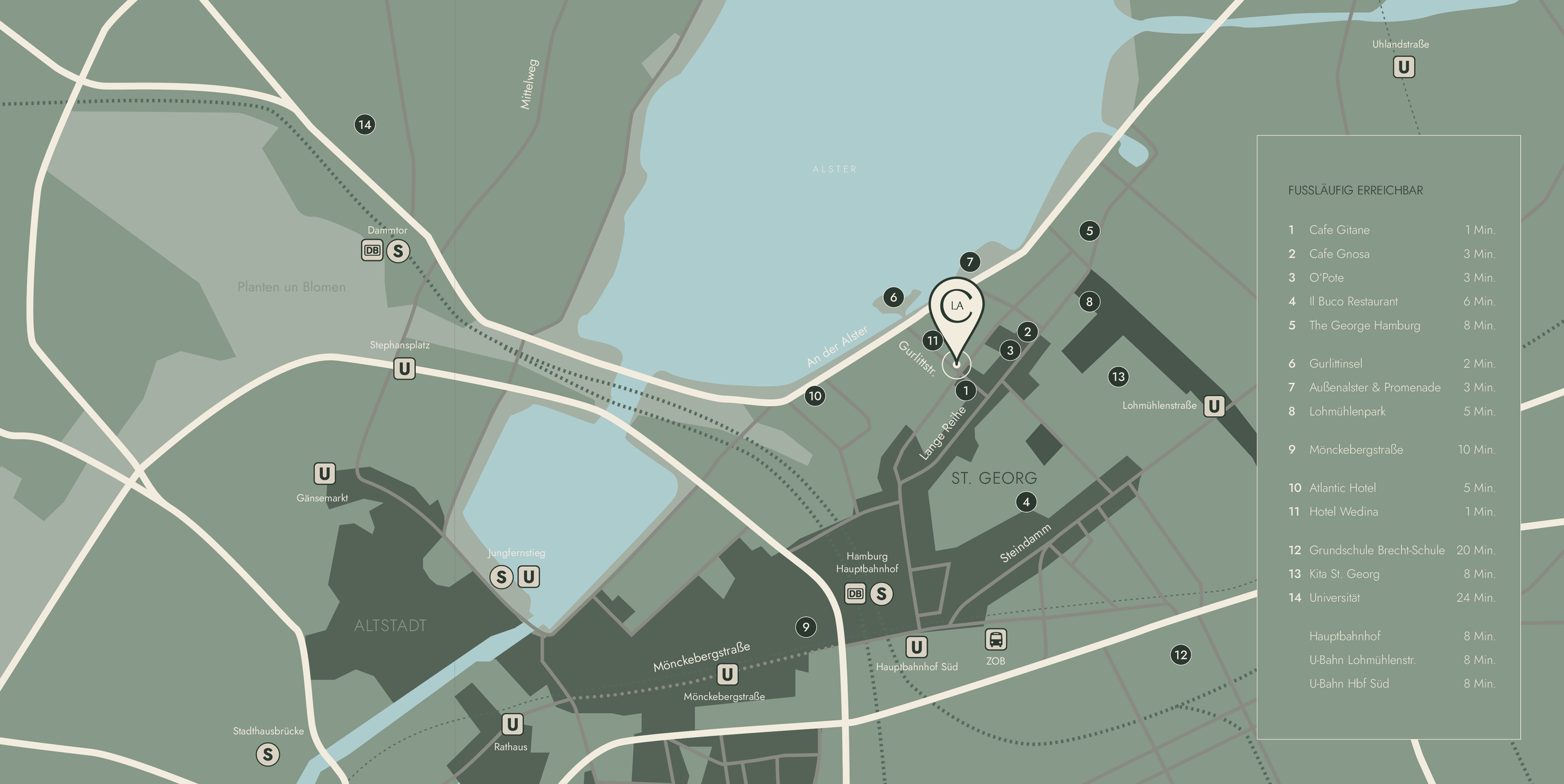 So ist es bei LA COUR: Von der Präsenz der beiden traumhaften Townhouses, die in einem geschützten Innenhof an der Alster in der Gurlittstraße entstehen, ahnen die Spaziergänger nichts.